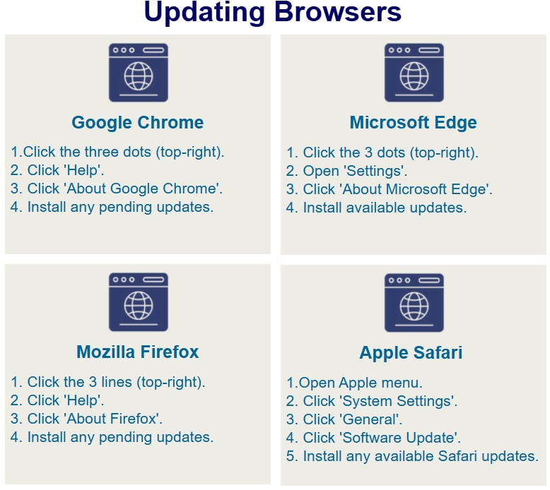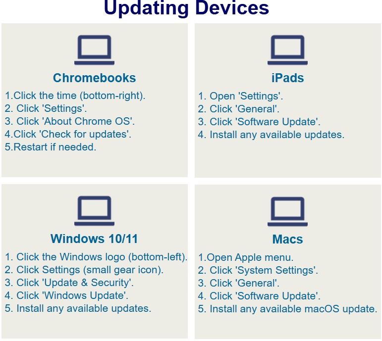 Save time and reduce stress during testing by checking in advance that each student device can run the test without problems. To help with this, make sure all devices and browsers are updated with the latest software. The guide below provides more information on how to do this.