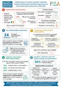 This report describes students’ experiences of mathematics in Ireland, their feelings towards the subject, and also trends in mathematics performance, both overall and across different content areas and cognitive processes. Drawing on data from the 2022 cycle of Programme for International Student Assessment (PISA), collected from 15-year-old students and their school principals, various aspects related to the teaching and learning of mathematics are examined and compared with international averages for the OECD and the EU. The composition of the mathematics classroom, and the role of digital technologies, are examined along with the disciplinary climate in the mathematics classroom. Student perceptions of various teaching behaviours and their own learning strategies are explored. The report goes on to look at students’ familiarity with and exposure to various aspects of mathematics, their attitudes towards mathematics and the extent of confidence and anxiety associated with mathematics, concluding with a discussion of the key themes that emerge from the data.